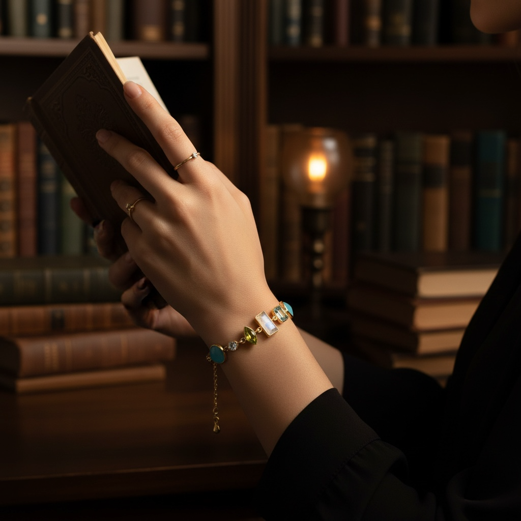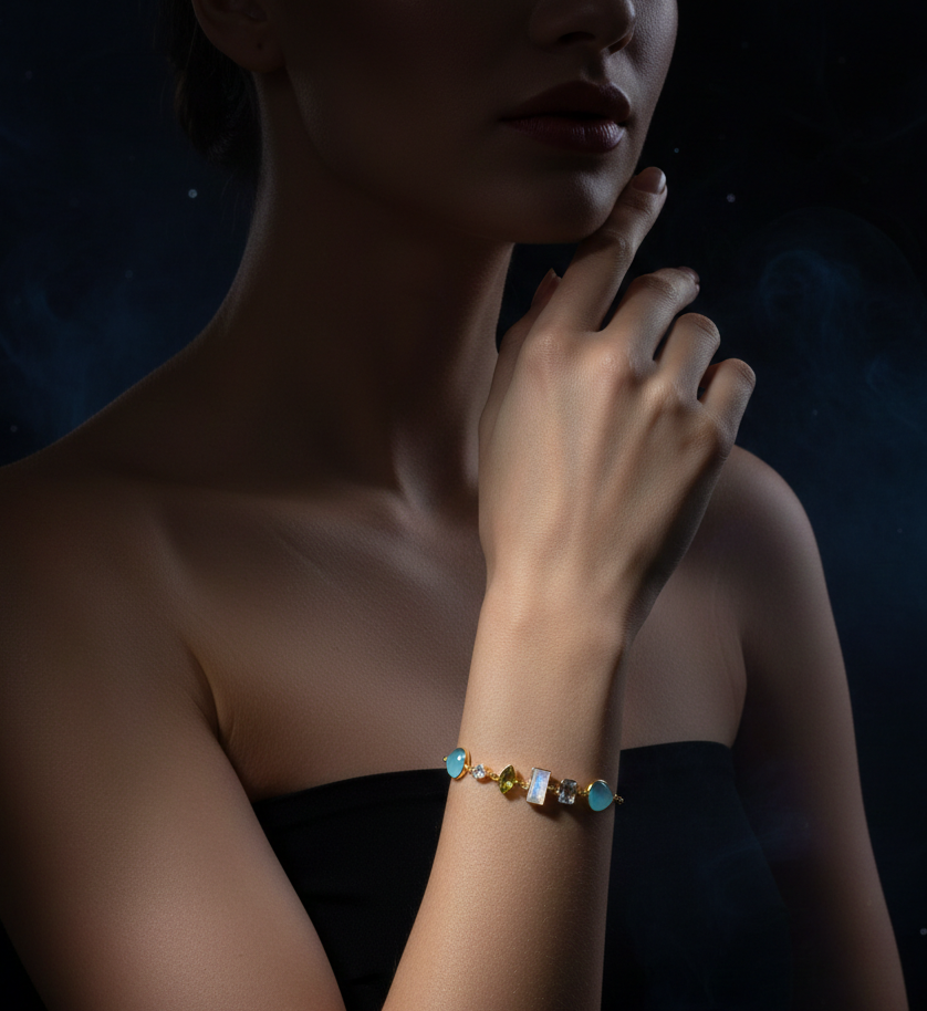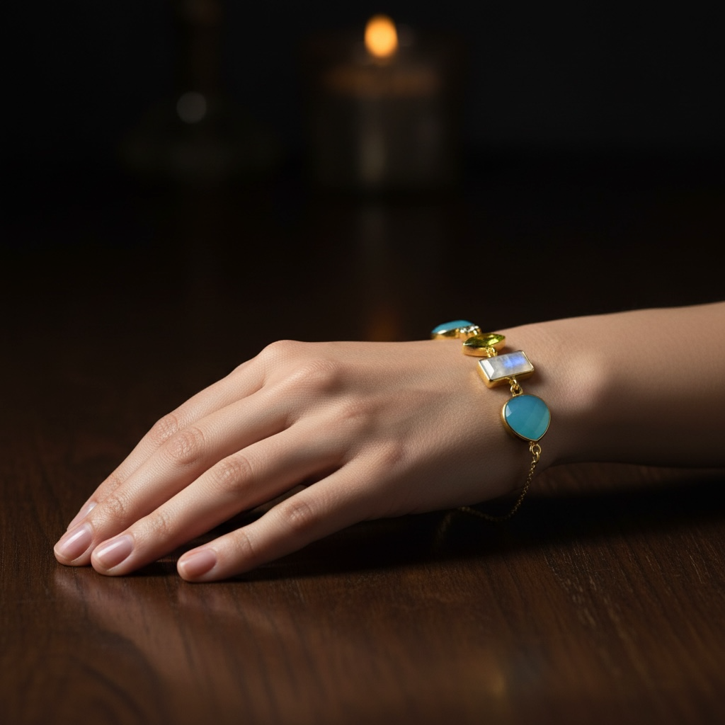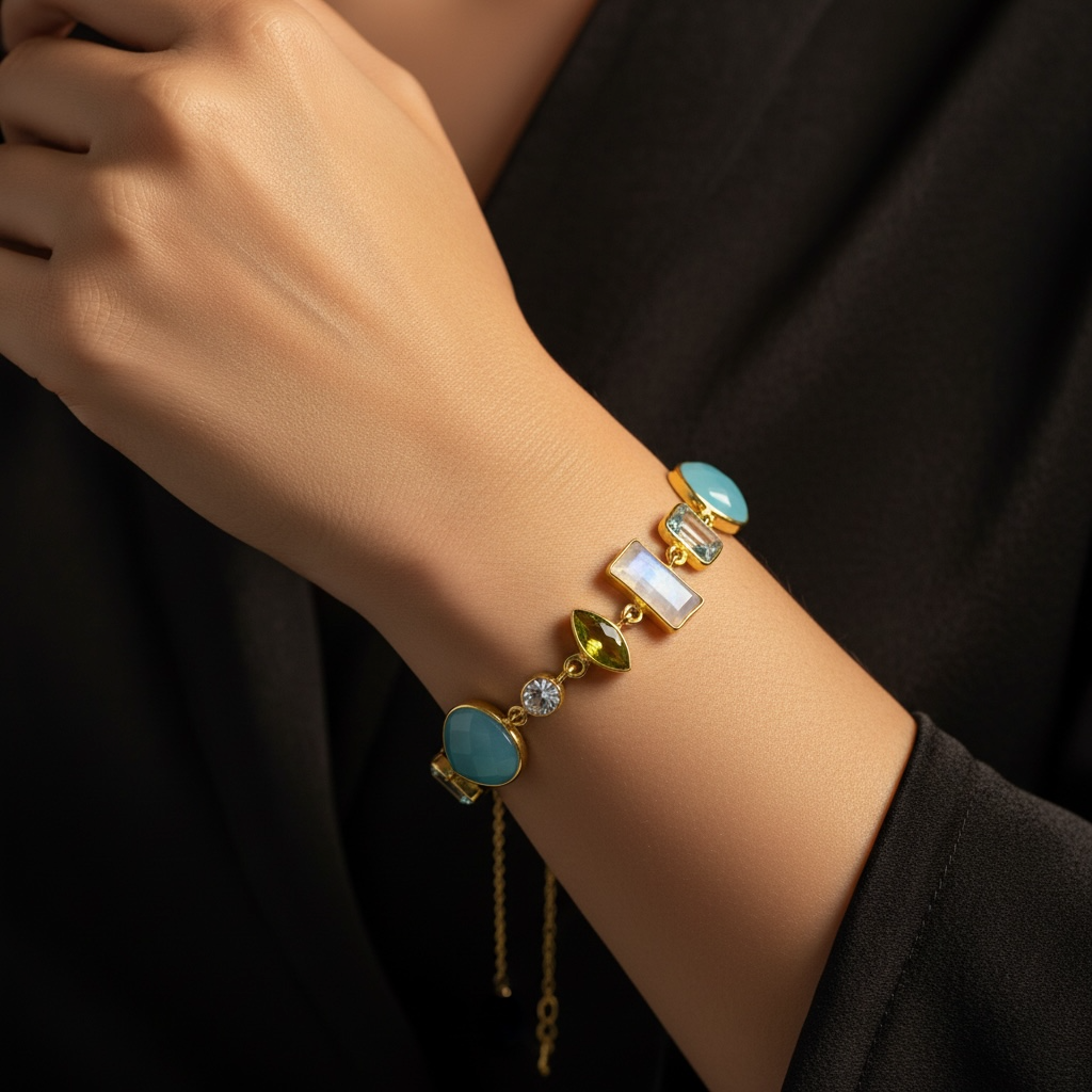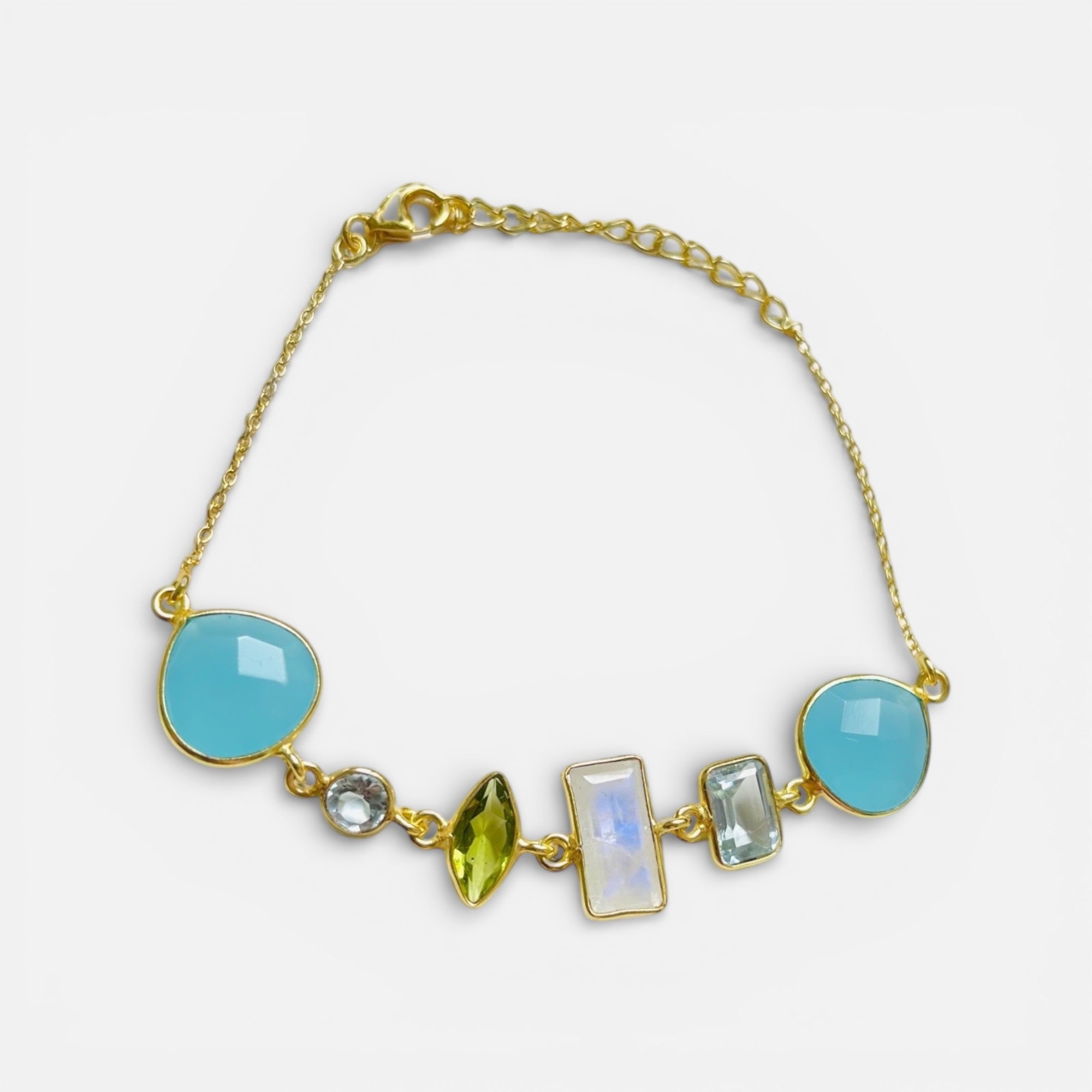The highlight of this bracelet, however, are the stunning gemstones that have been artfully incorporated into the design. The chalcedony, aquamarine, moonstone, and peridot were carefully selected to create a harmonious blend of colors and textures.