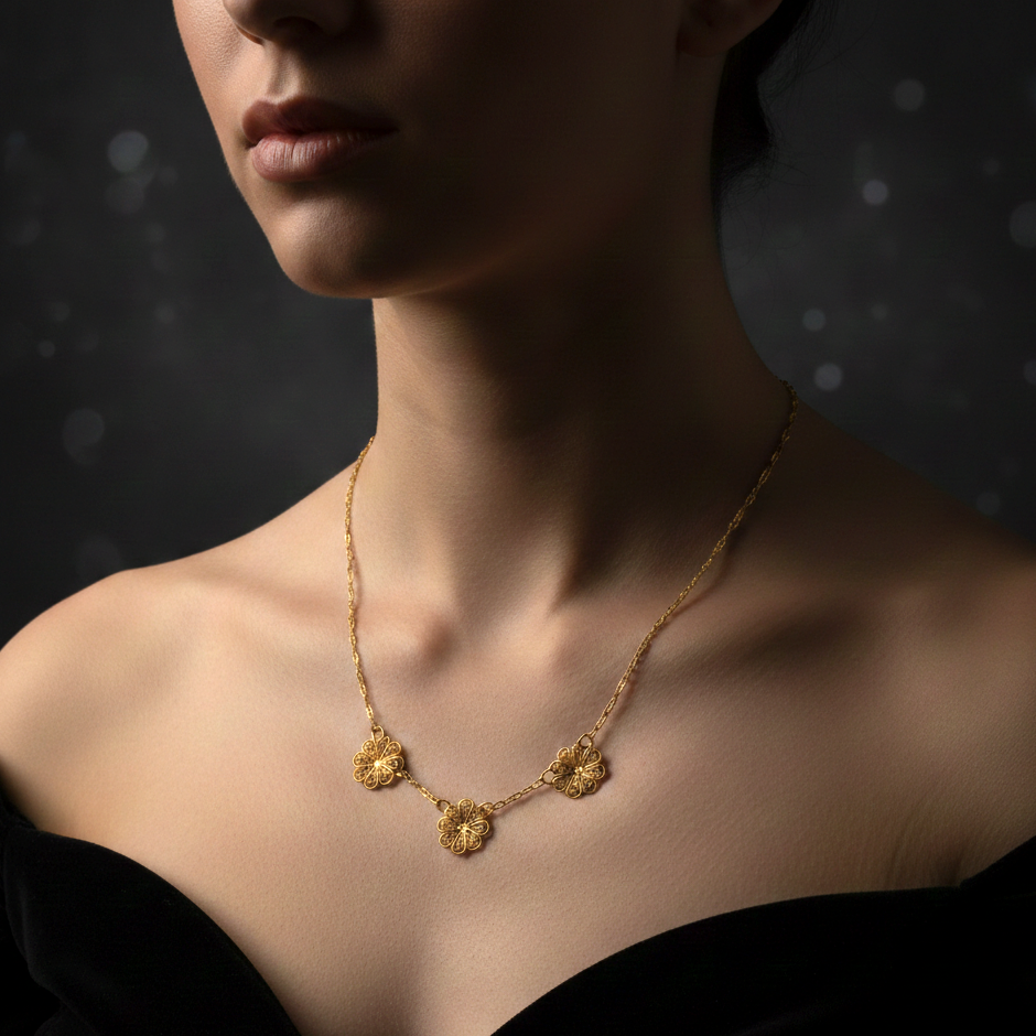 Made in the USA and inspired by the floral designs of the '70s, this necklace is the perfect accessory for anyone who loves vintage fashion and wants to add a touch of retro glamour to their wardrobe. The delicate details of the blossoms add a romantic, dreamy touch to your look, making it ideal for many occasions.