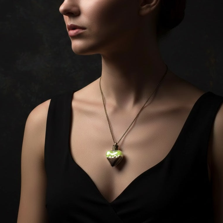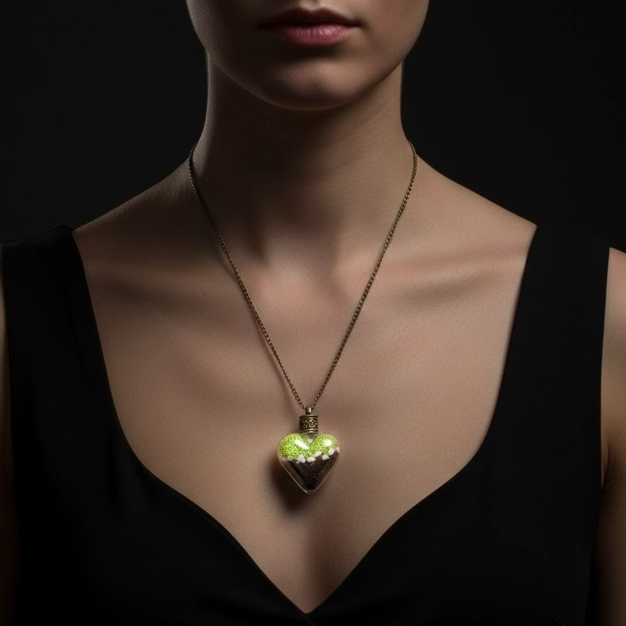 This beautiful heart-shaped terrarium pendant with a 70cm bronze chain is the perfect accessory for all nature lovers. Filled with moss, pebbles, and soil, the pendant offers a piece of nature to take home.