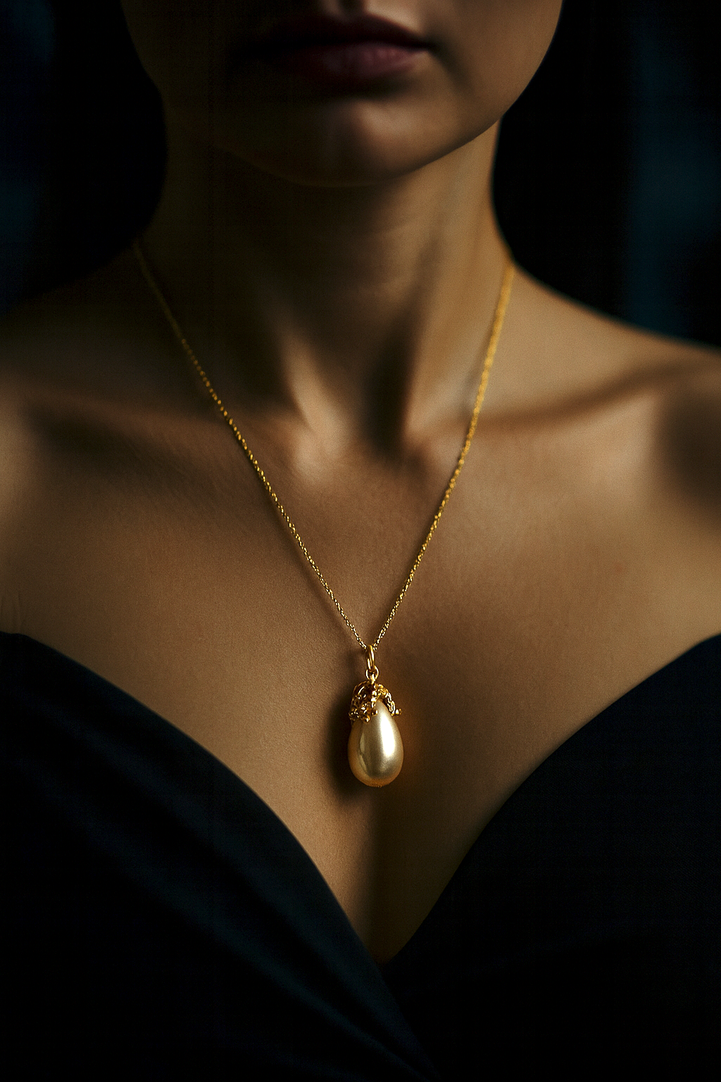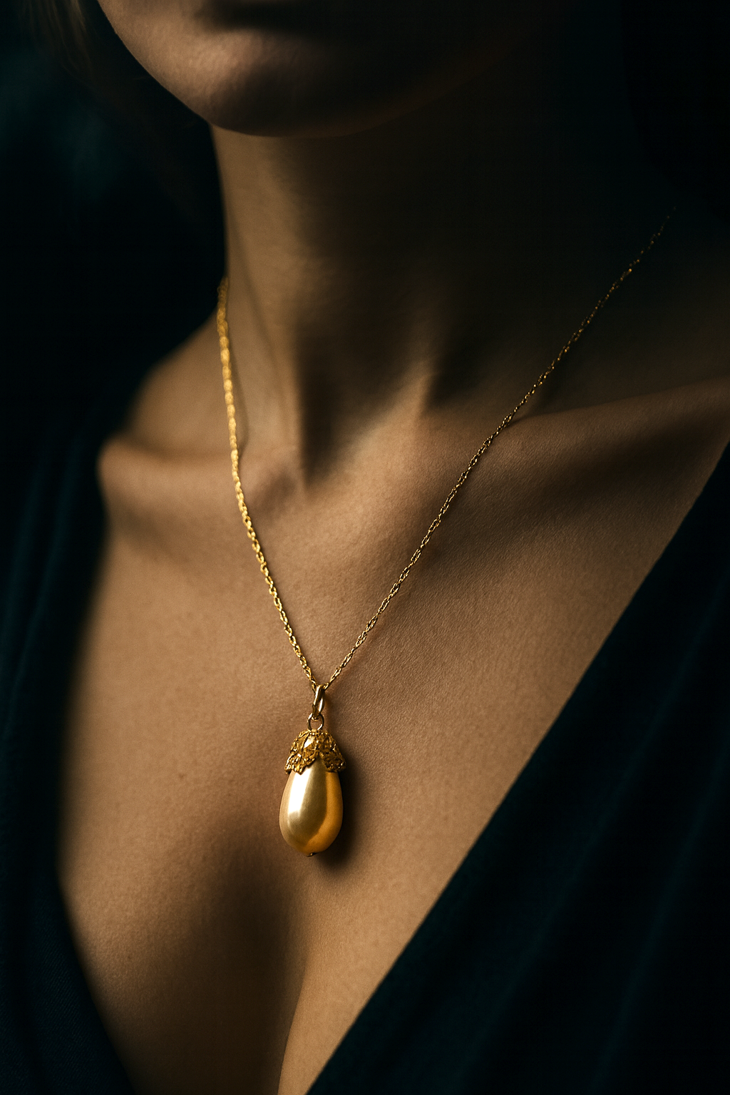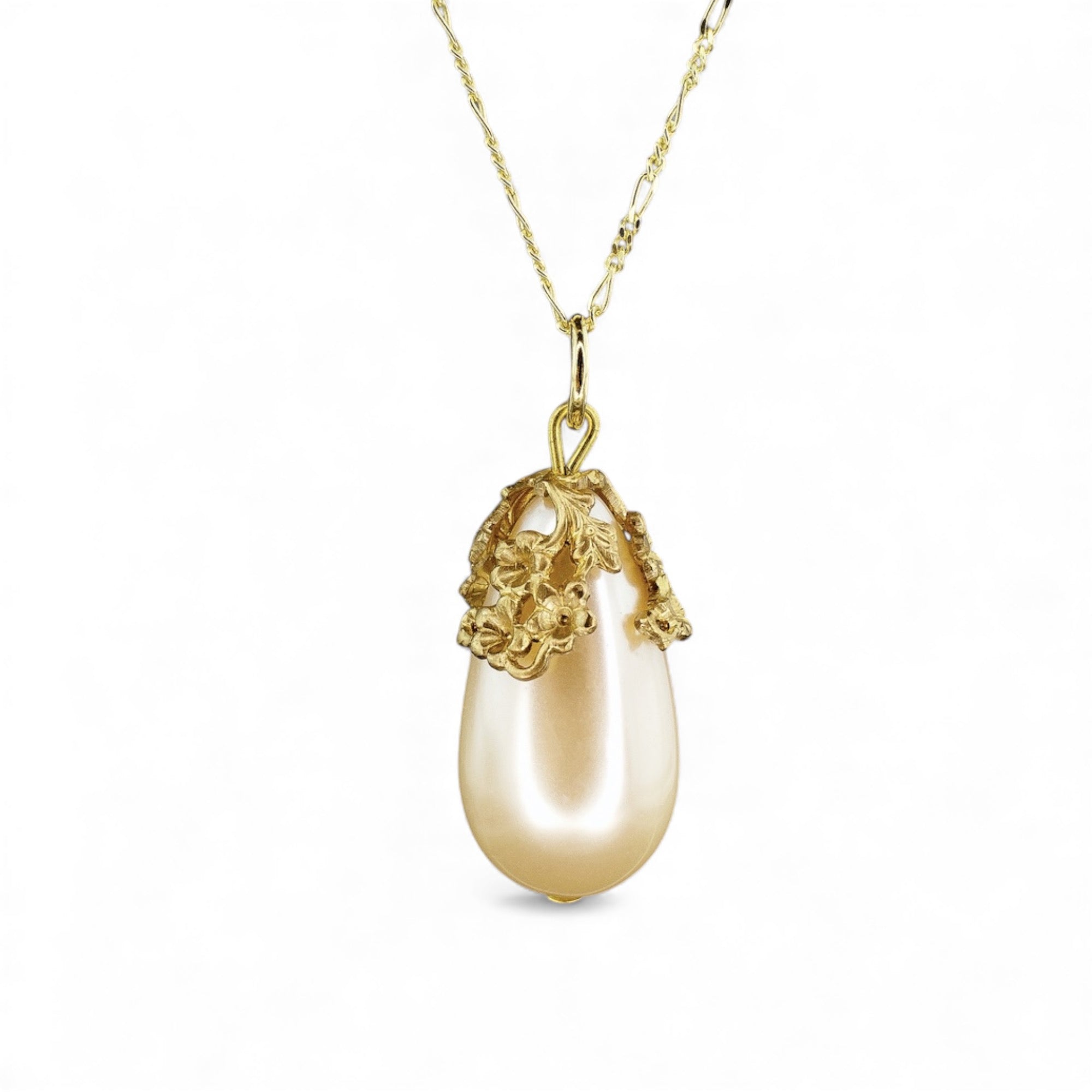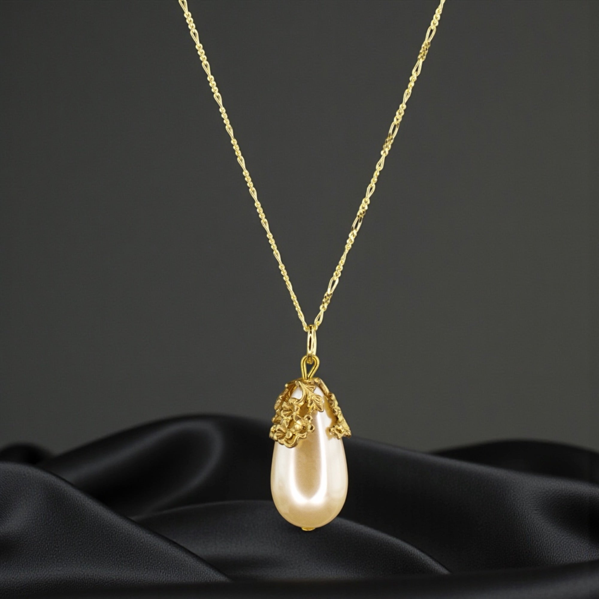 Diese 70 cm lange Halskette vereint feine Handwerkskunst mit zeitloser Eleganz. Die Kette besteht aus 925 Sterling Silber und ist mit einer langlebigen 18k Vergoldung veredelt. Der 3,5 cm große Anhänger ist eine echte südkoreanische Vintage Tropfenperle, umrahmt von einer goldfarbenen, hochwertig gearbeiteten Perlenkappe, die dem Schmuckstück einen edlen, klassischen Charakter verleiht.